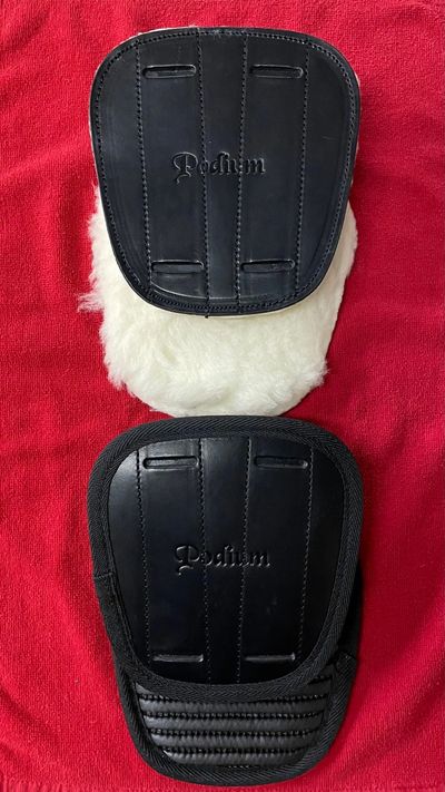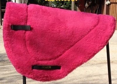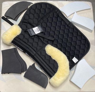 Lambskin wool on upper edging and on the underside for horse comfort (see Tack Talk for more details). The memory foam inserts spread the pressure peaks in 3 separate areas. Includes multiple sets of inserts with different thickness to provide perfect adjustment. Dimensions are 24" long (along top edge) and 19" deep.